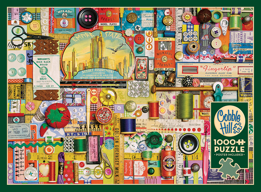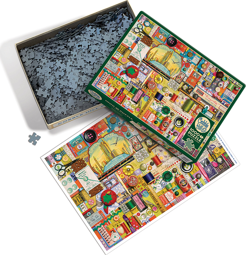 "Sew" wonderful we just had to share! This crazy quilting collage from Shelley Davies shows that a messy desk and a creative mind are always linked! From scissors to spools, with buttons and vintage stationary, this puzzle is every seamstress and sewist's dream!