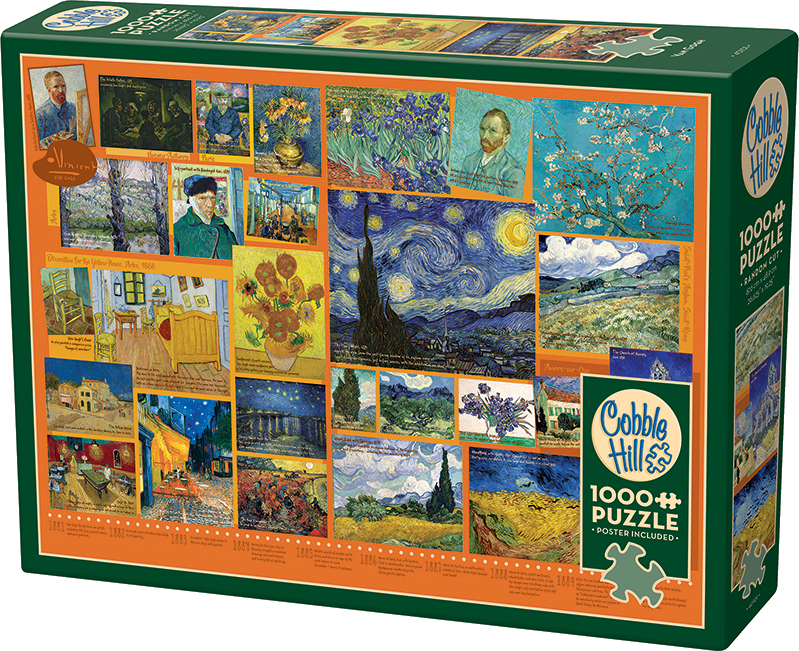 Learn about the life of "Van Gogh" in this 1000 piece collage celebrating his works. Informational quotes give a brief explanation of the painting giving one a deeper look into this artist's world. Designed by Cobble Hill Creations.