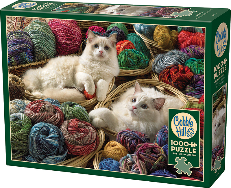 What's better than one Ragdoll sitting in basket surrounded by colourful skeins? Two white Ragdoll cats with beautiful blue eyes staring up at you! These fluffy felines look so comfortable nestled in their wicker baskets surrounded by multi-coloured yarn in all the colours of the rainbow.