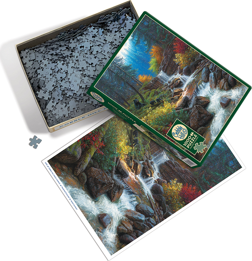 The little bear cubs play follow the leader down the tree logs as they head towards the cold rushing water flowing down the Mountain Cascade in this 1000 piece puzzle set in an autumn forest.