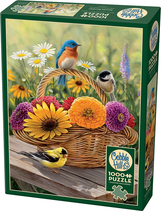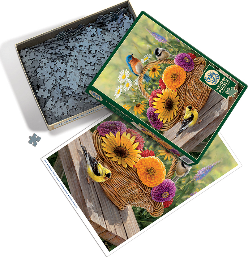 A Summer Bouquet of gorgeous pink, purple, and orange mums with a yellow daisy sits inside a basket set upon a wooden picnic table. The flowers are the perfect perching spot for a blue bird, nuthatch, and yellow finch bird. The top quarter of the puzzle has a blurred background, which may make it more challenging for some to assemble, especially in 1000 pieces. This puzzle is in portrait orientation.