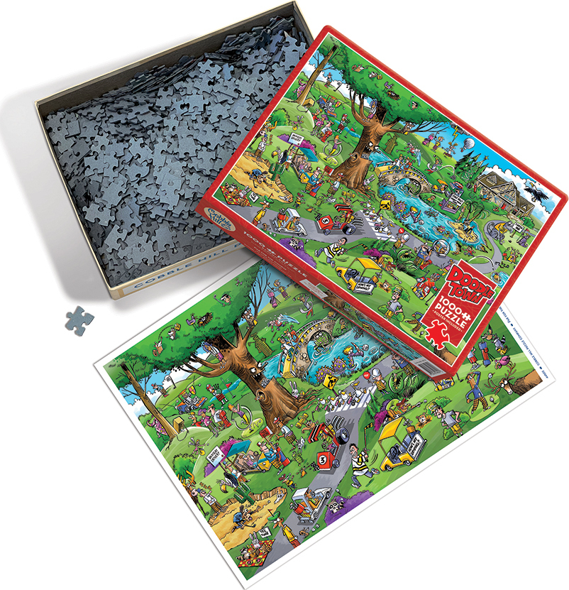 Fore! Watch out because this golf puzzle is full of punny dad jokes like "How's my driving?" and "Backseat Driver". And don't miss the wildlife having a "tee time" picnic near the sand trap, while the ducks literally cross the road (they should've been chickens)! This 1000 piece puzzle isn't just for fans of golf because there are too many funny antics going on to discover like the tree that eats all the golf balls, the venus fly trap, golfers getting struck by lightning, a monster frog under the bridge. But of course, it's just Par for the Course in this Doodletown puzzle.