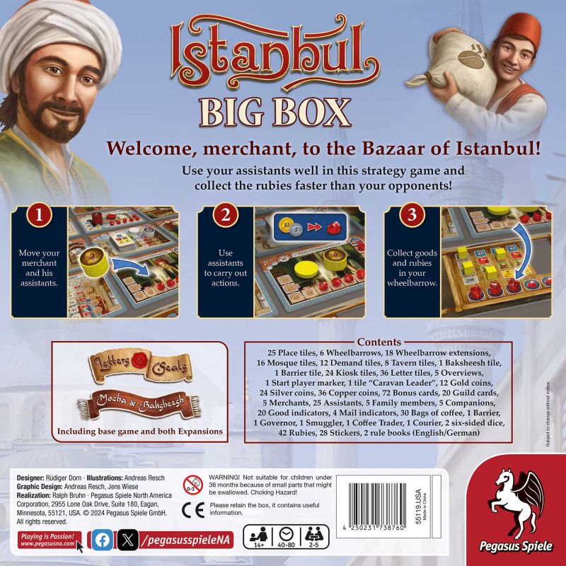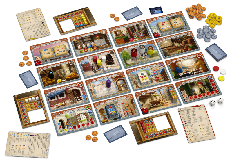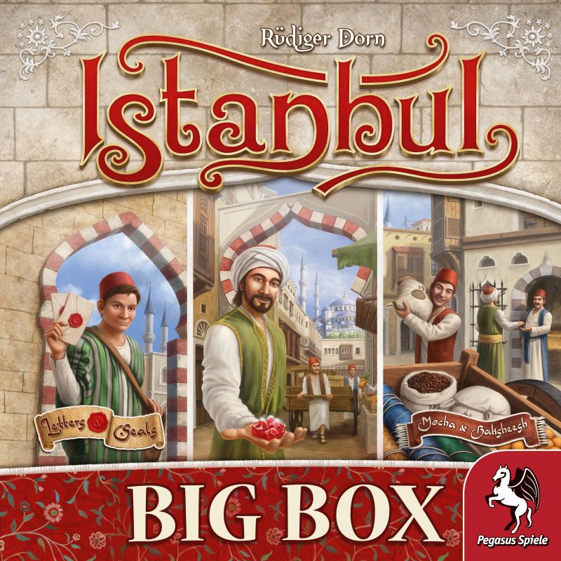Istanbul: Big Box combines the award-winning classic game Istanbul, with both expansions, Mocha & Baksheesh and Letters & Seals. This combination allows players to build an epic-sized market of 5 x 5 tiles.