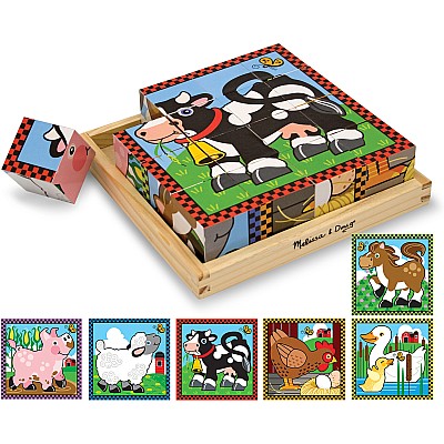 Six puzzles in one! There are 16 solid wooden cubes in this unique puzzle. Rotate the cubes in the included wooden tray to complete colorful pictures of six different farm animals. (The border design provides a helpful hint!)